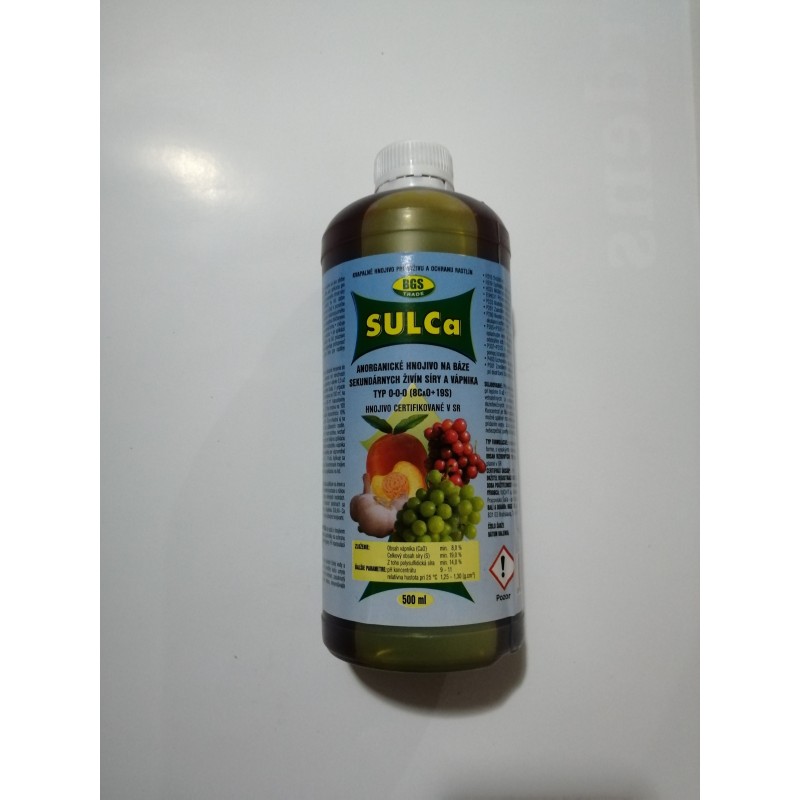 OŠETRENIE STROMOV– ovocné stromy a kríky, broskyne, vinič – prvý postrek pred pučaním 1,5 až 2,5 % roztok PRIHNOJOVANIE SÍROU A VÁPNIKOM – všeobecne vegetačný kľud rastlín a drevín 0,5 až 1,5 litra/100 m2 Príprava 1 % roztoku = 100 ml (1dcl) na 10 l vody. Pri zmiešaní 250 ml balenia do 10 l vody získate 2,5% roztok Anorganické tekuté hnojivo, typ C.2.5. Obsahuje síru a vápnik. Je to podobný výrobok, ako bola Sulka, ktorá sa už nevyrába. - SUL Ca je určená na základné hnojenie do pôdy ale aj na listovú aplikáciu. Priaznivo pôsobí proti prezimujúcim škodcom. 4% koncentráciu vyrobíte nasledovne. Pre morenie cesnaku, cibúľ kvetov použite 4% koncentráciu. Do 1 litra vody nalejte 40ml hnojiva Sulca. Odporúča sa ich namáčať počas 6-12 hodín v 4% roztoku, nechať vysušiť a potom vysadiť.